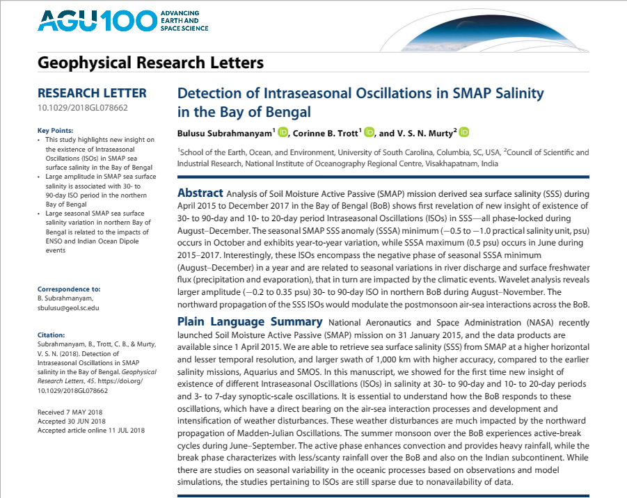 25 | Detection of Intraseasonal Oscillations in SMAP salinity in the Bay of Bengal. Geophysical Research Letters, 45. | 2018 | ![]() |