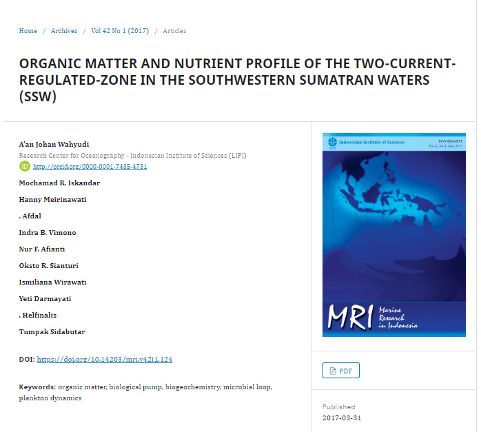 30 | ORGANIC MATTER AND NUTRIENT PROFILE OF THE TWO-CURRENT-REGULATED-ZONE IN THE SOUTHWESTERN SUMATRAN WATERS (SSW) | 2017 | ![]() |