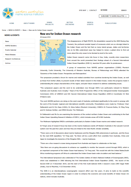 New era for Indian Ocean research , Western Australia Marine Science Institution (WAMSI), 28 January 2016
