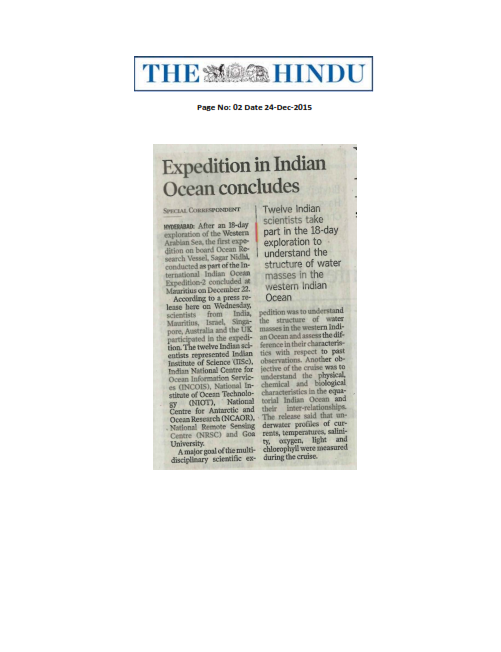 Expedition in Indian Ocean concludes ,The Hindu, December 24, 2015